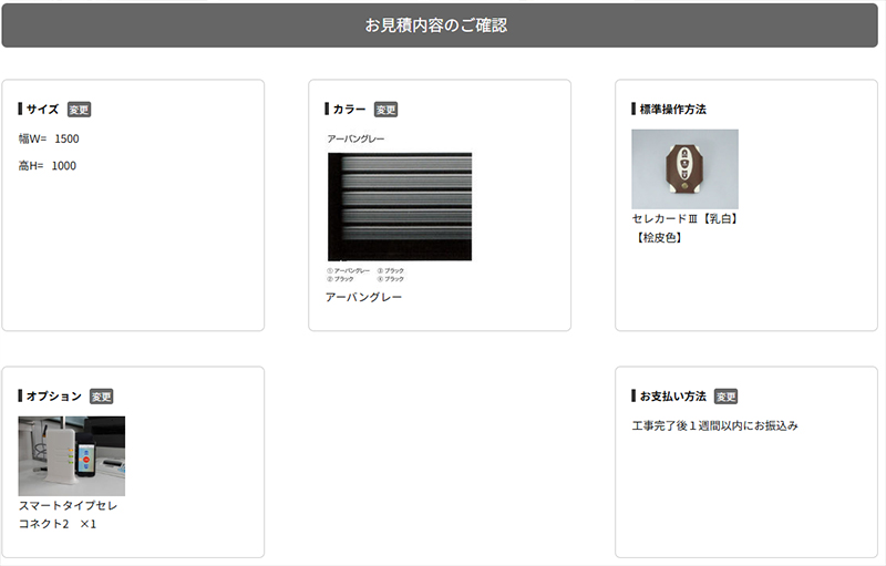 こちら内容を変更する際は、改めてカラーや寸法を入力し直していただければ、その都度差し替え金額が表示されます。