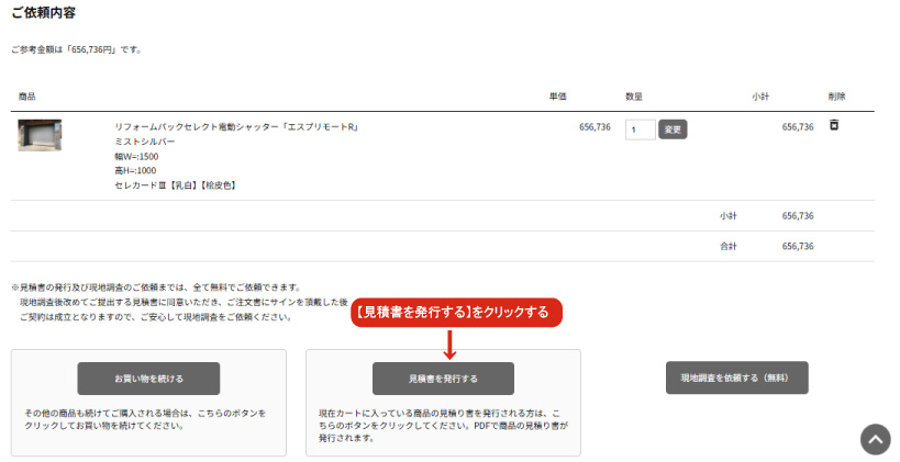 カートの中身を確認して、【見積書を発行する】をクリックしてください。