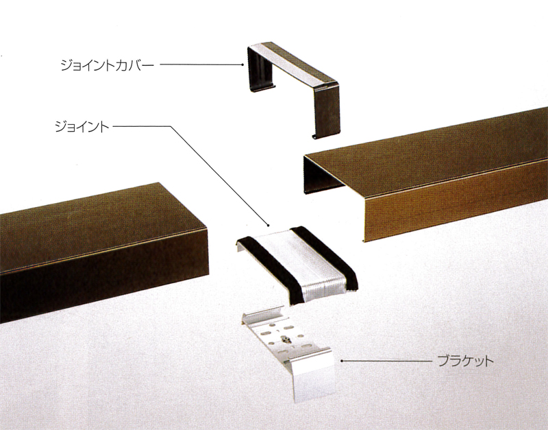 笠木のジョイント部分に使用する「ジョイントカバー」「ジョイント」「ジョイントブラケット」の構成図・90度コーナー納まり図になります。