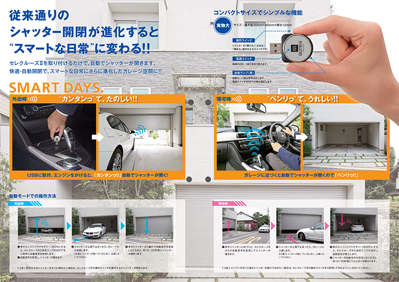 セレクルーズⅡは車のバッテリーから電気を供給、停止される事で、シャッターを自動開閉させる装置です。