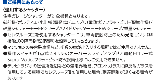 セレクルーズⅡの自動開閉機能が発揮されない場合がございますので、 下記採用上の注意事項を事前にご確認の上、ご採用を検討ください。